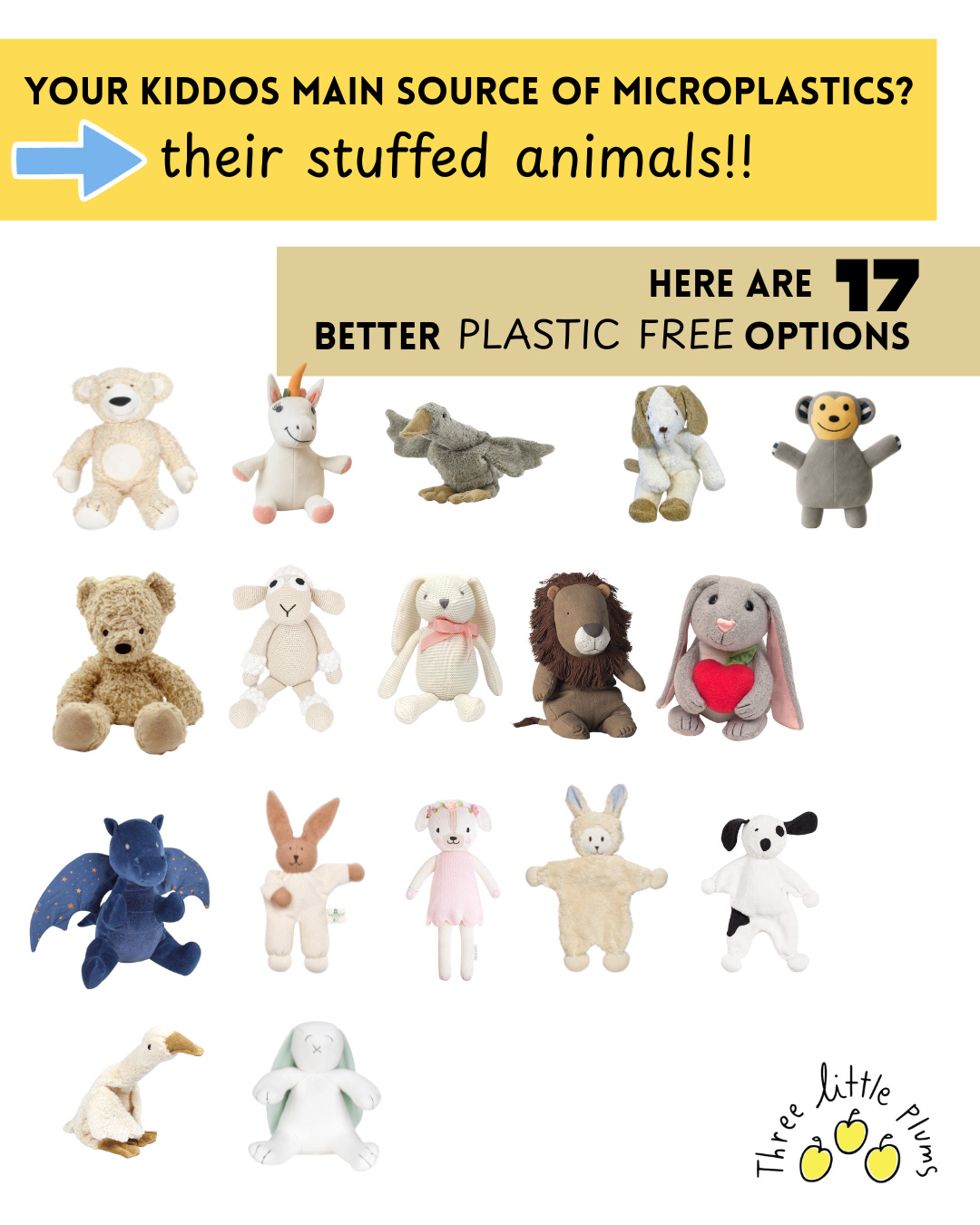 99% of stuffed animals are made out of polyester. The main concern is that these toys give off massive amounts of micro and nano plastics into the air and dust and our children’s bodies. Most little kids play with stuffed animals at very close quarters ( meaning they are being hugged, they are being slept with, chewed on,,,you get the idea) thus increasing the amount of micro plastics being inhaled/ ingested.